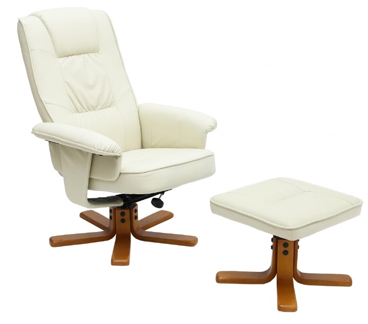 Althorpe Recliner PU with Wooden Legs, 720W x 1170D x 860H, Recliner with Stool, 705W x 700D x 950H, Upright Black, Brown, Cream.