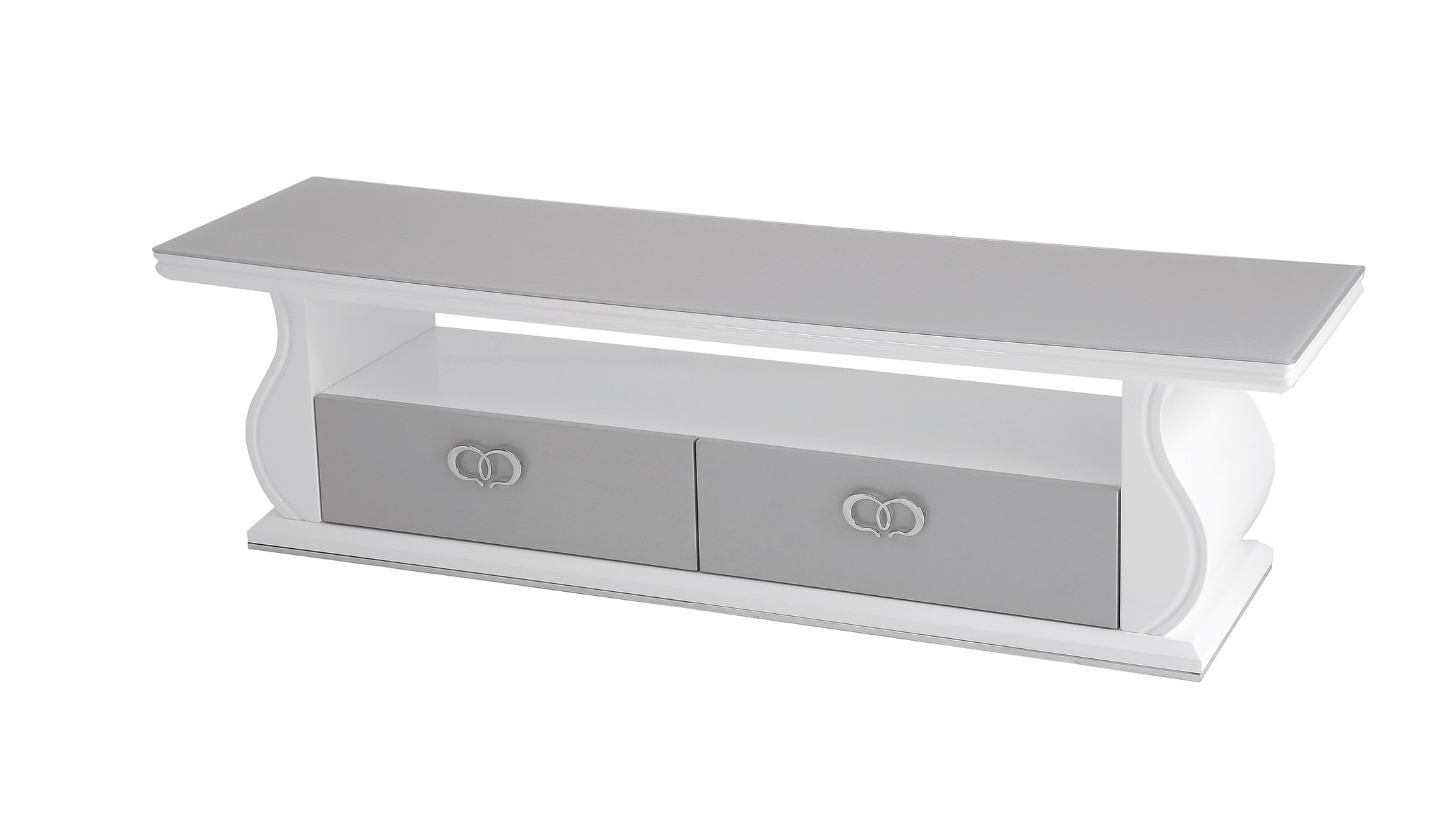Black tempered glass with grid design, white high gloss bottom shelf and cabinet, black drawer. Dimensions : L150 X W40 X H40CM Colours Available : Black/White , Grey/White