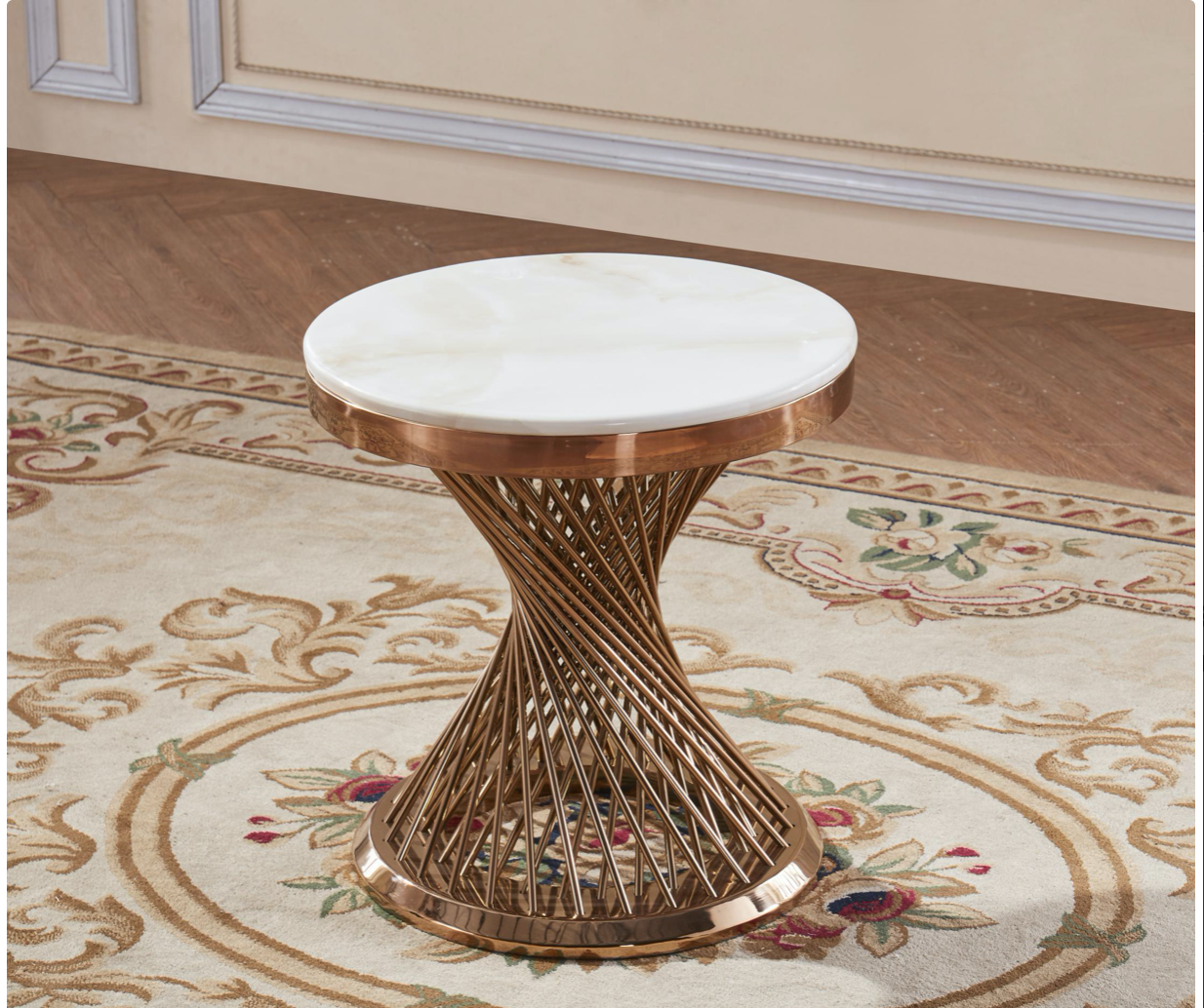 Natural Stone with Marble Effect and Lacquer Finish, White and Stainless Steel, Rose Gold Colour, Pescara Lamp Table Round 500W Round x 550H